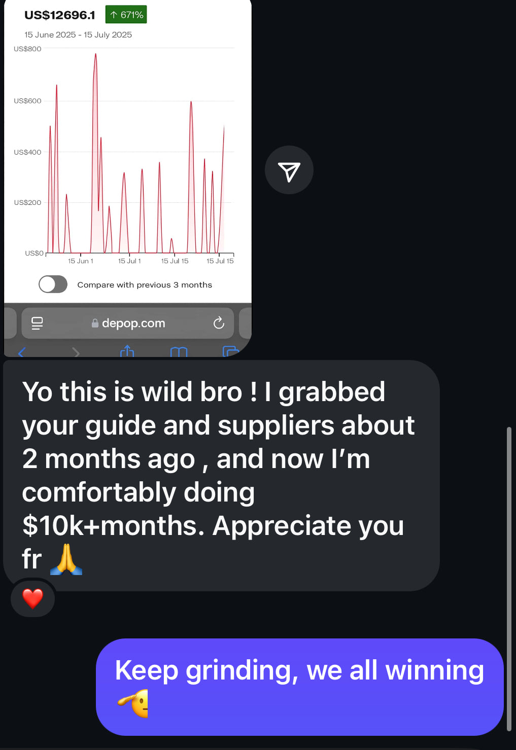 Every day, people message me saying they’re making thousands using my supplier list.Same list. Same guide. Same opportunity — but they took action.